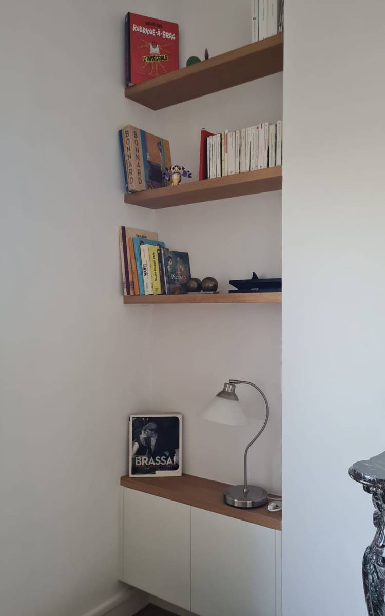 Cette bibliothèque en chêne massif sur mesure a été conçue pour s’adapter aux contraintes de faible profondeur des alcôves qui l'accueillent, de part et d'autre d'une cheminée en marbre.