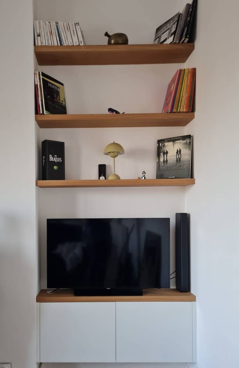 Les clients ont choisi de laquer les éléments bas en blanc, créant un contraste saisissant avec les étagères en chêne massif et mettant en valeur le bois naturel.