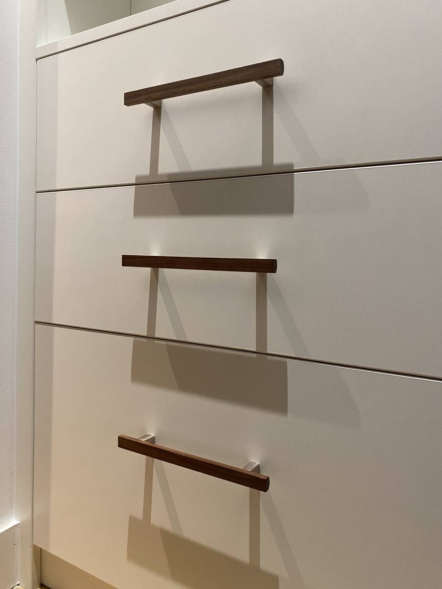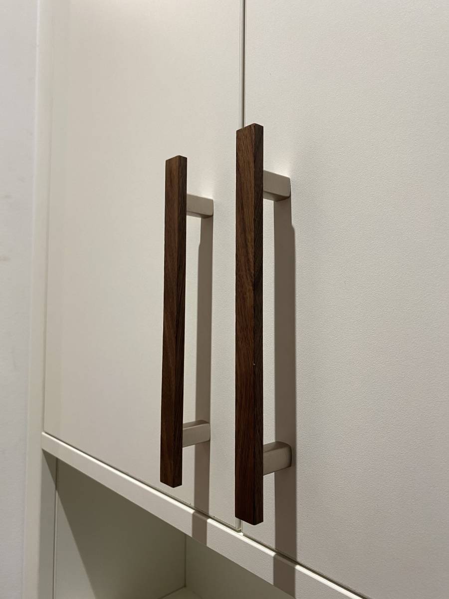 Pour ce projet, l’équipe a opté pour la poignée Araw en bois massif. Le noyer, noble et raffiné, contraste avec le blanc du mélaminé pour un effet visuel chaleureux et distinctif. Contrairement aux tendances qui minimisent les poignées, celles-ci s’affirment comme un élément décoratif à part entière, ajoutant du caractère au meuble. Le veinage naturel du noyer signe une harmonie subtile entre nature et sophistication.