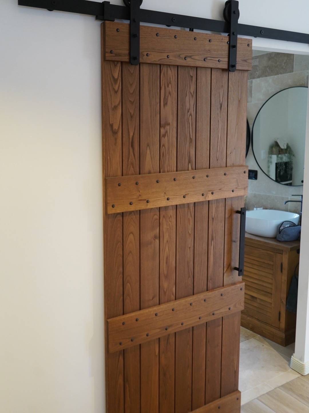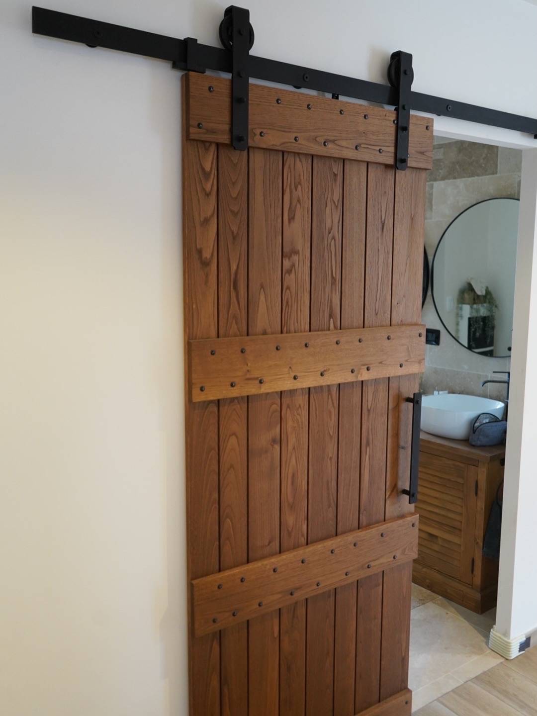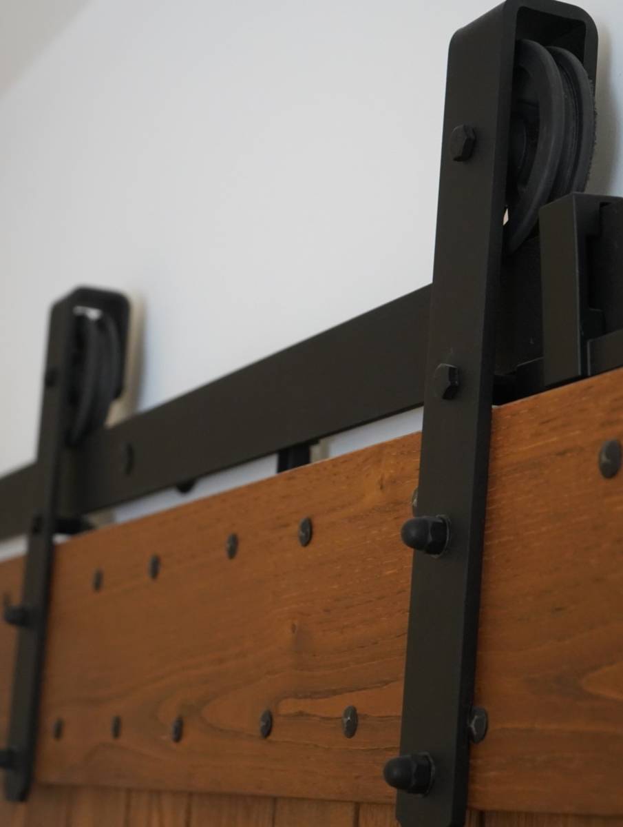 Afin d’allier esthétisme et confort d’utilisation, la porte coulissante a été équipée d’un kit rail avec amortisseur, de montures en métal noir et d’une poignée bâton assortie. Des clous forgés à tête martelée ont apporté une touche décorative authentique.