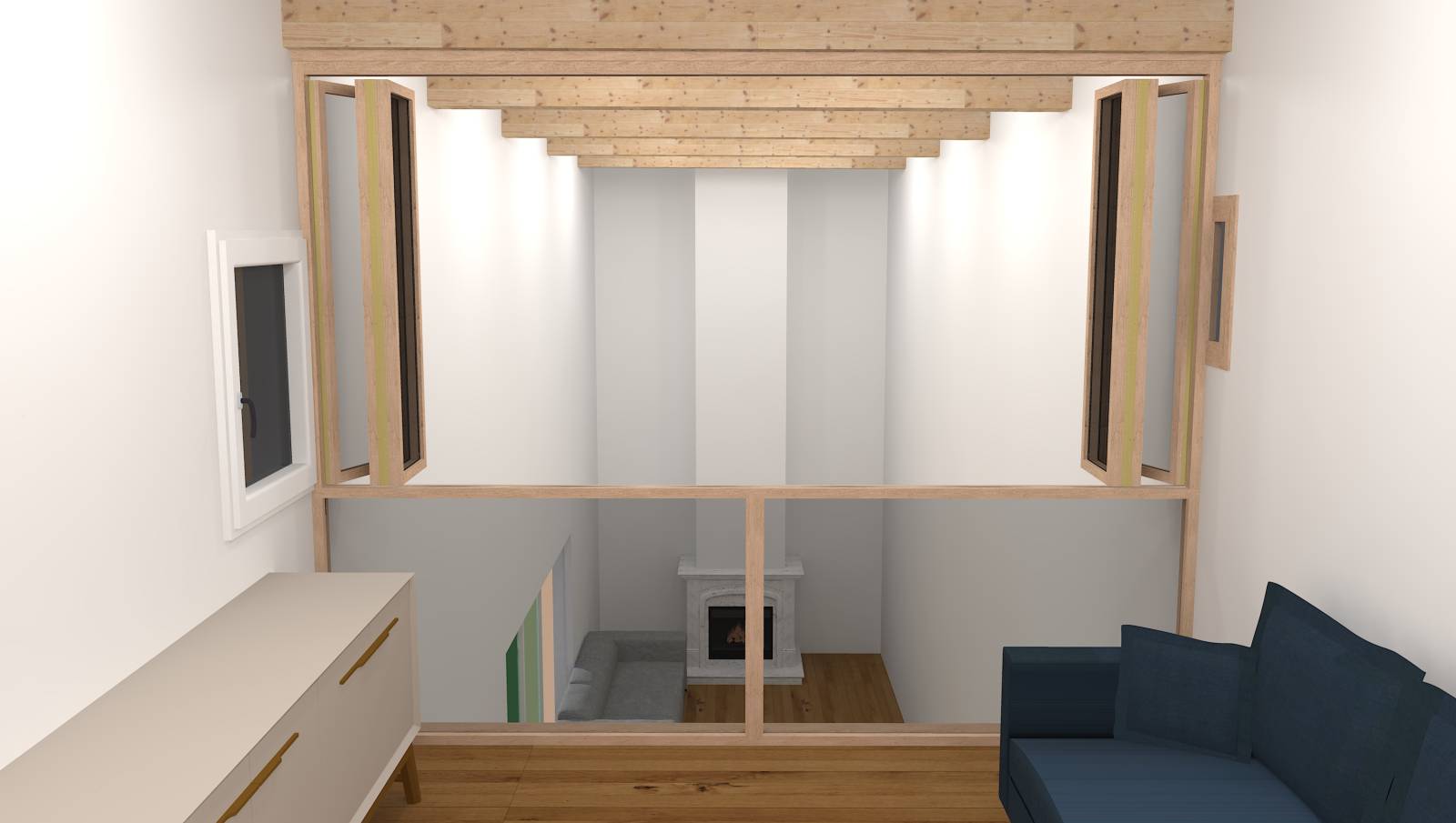 Le but était de sécuriser et de séparer l'espace de la mezzanine afin que celle-ci puisse être utilisée en tant que chambre d'appoint. Son utilisation habituelle étant un salon TV, la partie haute de cette verrière bois est ouvrable en vantaux accordéon et la partie basse est un soubassement vitré fixe.