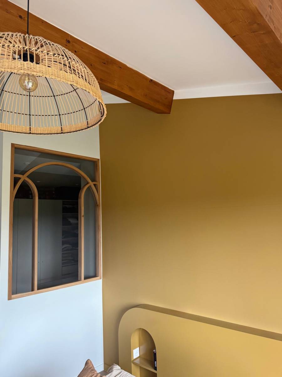 La tête de lit en bois laqué couleur moutarde s’intègre parfaitement dans l’architecture intérieure, en continuité des murs existants.